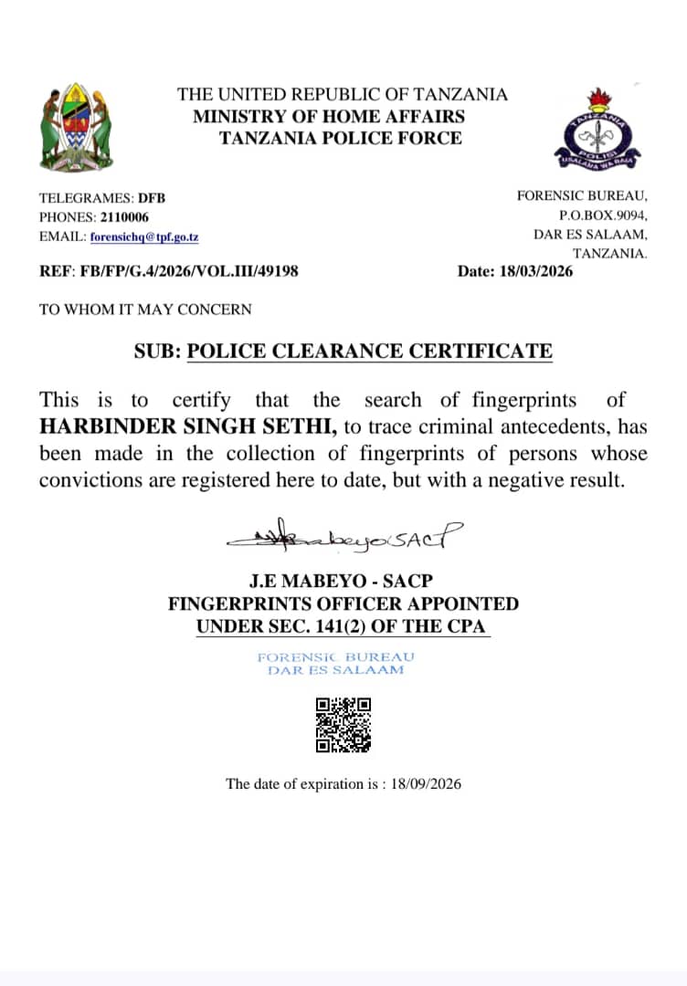 The Forensic Bureau processed Harbinder’s fingerprint search to verify if he had any registered convictions in Tanzania.